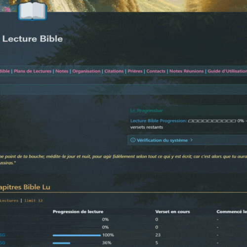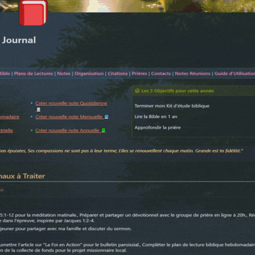 10 dashboard de section (y compris "Lecture Bible" et "Journal")